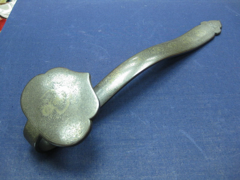 The front of the shaft inlayed with five quatrefoil reserves, each with another set of five-clawed dragons and flaming pearls, as on the head, all on ¡§wan¡¨ diaper ground. The back with silver-inlayed archaistic characters within a double border. The elegantly curved shaft ending in a double silver inlayed ¡§ruyi¡¨.