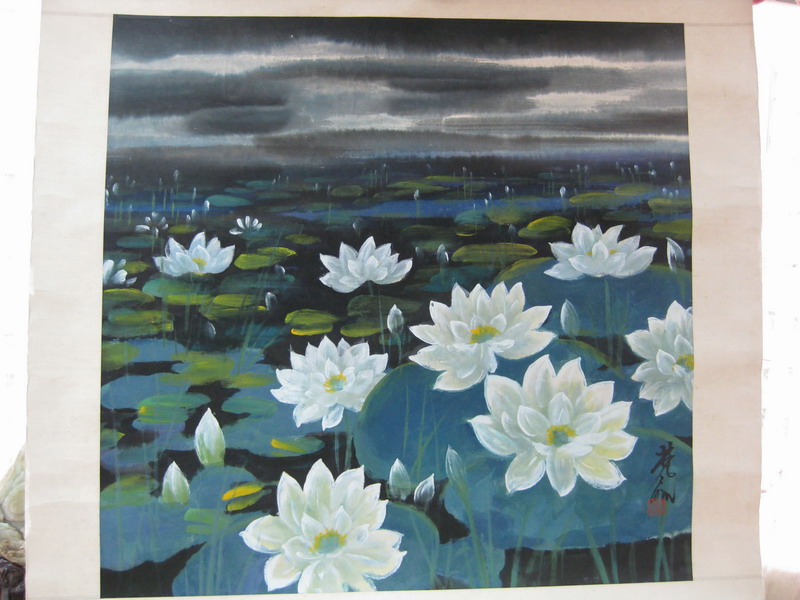 This painting is illuminated by a powerful graphic design which uniquely combines traditional Chinese subject matter with Western watercolor technique and perspective. The artist, Lin Feng Mian (1900-91) studied in France, returned to China and eventually settled in Hong Kong. He is greatly respected as a trendsetting 20th century artist who also wrote prolifically about harmonizing the different qualities of Western and Chinese art. This painting is created in a square format favored by the artist as a significant departure from traditional Chinese rectangular scrolls and is an exemplary Modern rendition of a classical Chinese flower painting.